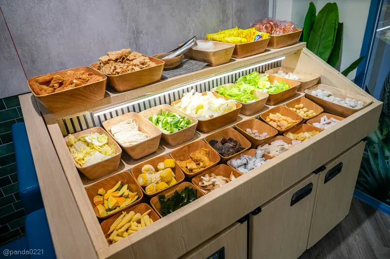 鍋泰暖桃園中壢店的蔬菜自助吧有27種時蔬、火鍋料和副食。原型食材比火鍋料還多,有大白菜、金針菇、高麗菜、南瓜、玉米、杏鮑菇等;火鍋料像是蛋餃、魚餃、丸子、麻吉燒等等,副食也有冬粉、王子麵和意麵喔!