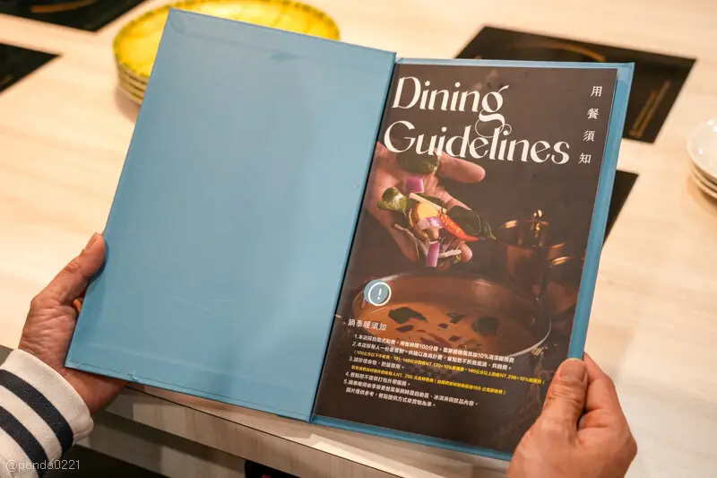 鍋泰暖桃園中壢店採自助式點餐,用餐時間為100分鐘,另加收10%服務費。本店採每人一份套餐制,共鍋以身高計費,單點恕不折抵低消及共鍋。主食有牛肉、豬肉、雞肉、鴨肉和海鮮,也可單點。還提供雙人套餐和三人套餐。【完整菜單】