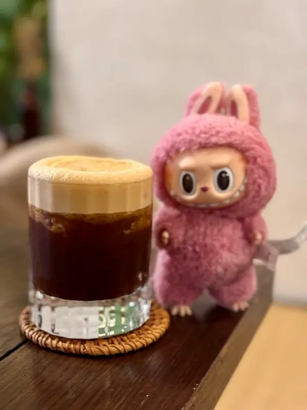 那天與朋友聚會前,正好在桃園火車站拿了一盒拉布布馬卡龍。粉紅色的荔枝LABUBU搭配咖啡與甜點,不僅增加了視覺上的趣味,也讓這頓下午茶更加熱鬧有趣。