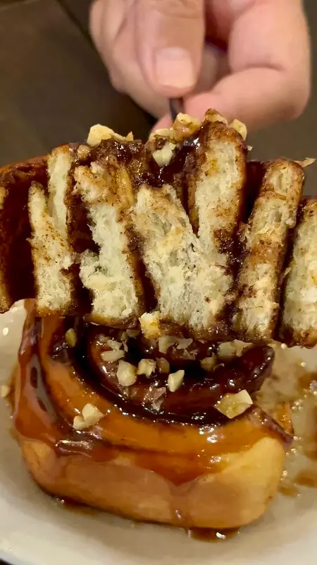 鬆軟的肉桂捲淋上濃郁的太妃糖醬,頂部撒滿堅果增添脆口層次。
