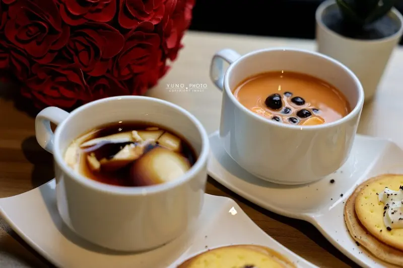 豆花以濃郁的豆香為基底 搭配兩種風味選擇 泰式奶茶與傳統黑糖