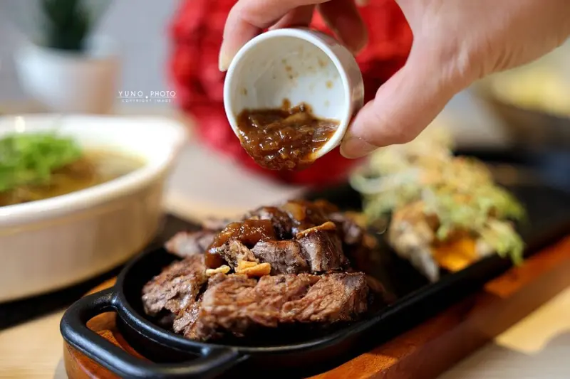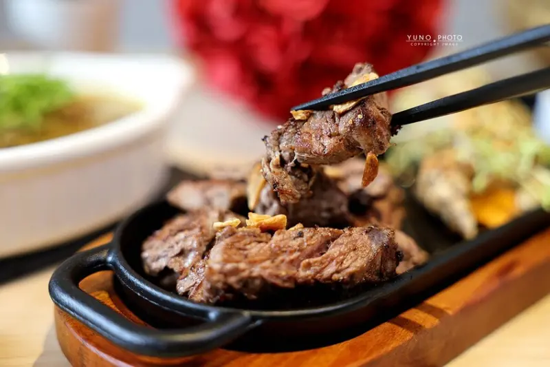 肉質軟嫩搭配香脆的蒜片、紅酒醬汁增添多層次風味