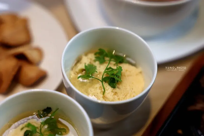 蒸蛋柔軟清香搭配豐富肉片、彈牙小鳥蛋增添風味及口感 在口中湯汁與蛋香交織 溫暖而滿足