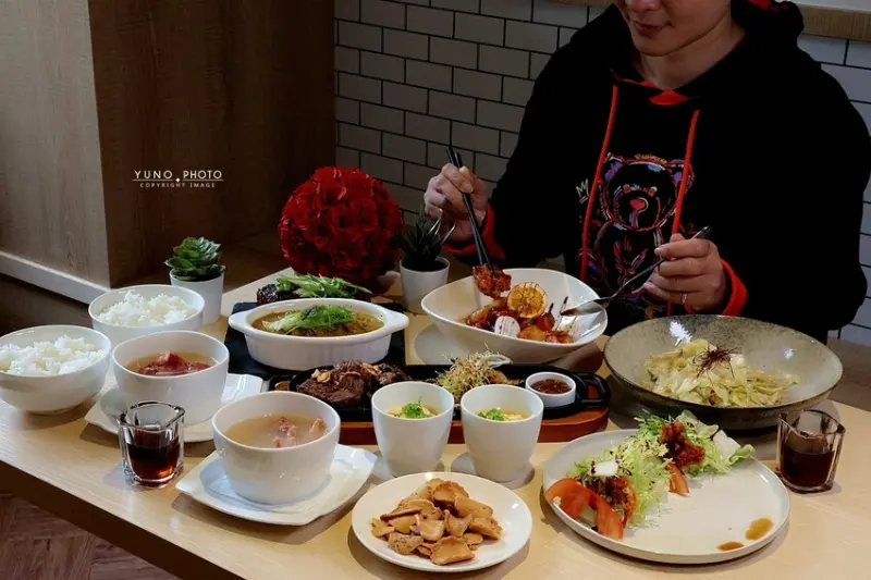 內含蒸蛋、每日例湯、季節炒青菜、肉品主食、海鮮、白飯、特調飲品及甜點