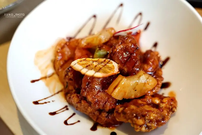 酥炸里肌肉外酥內嫩 糖醋醬汁則融合了泰式酸辣風味 帶有一絲清爽的香氣