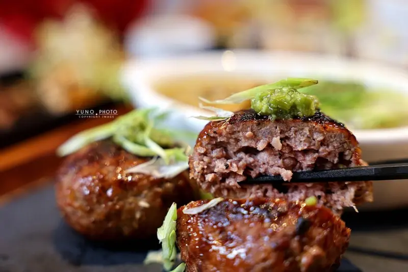 漢堡排經炭火烘烤 外皮微焦 散發著迷人的炭香 而內部的肉餡紮實多汁 搭配上山葵