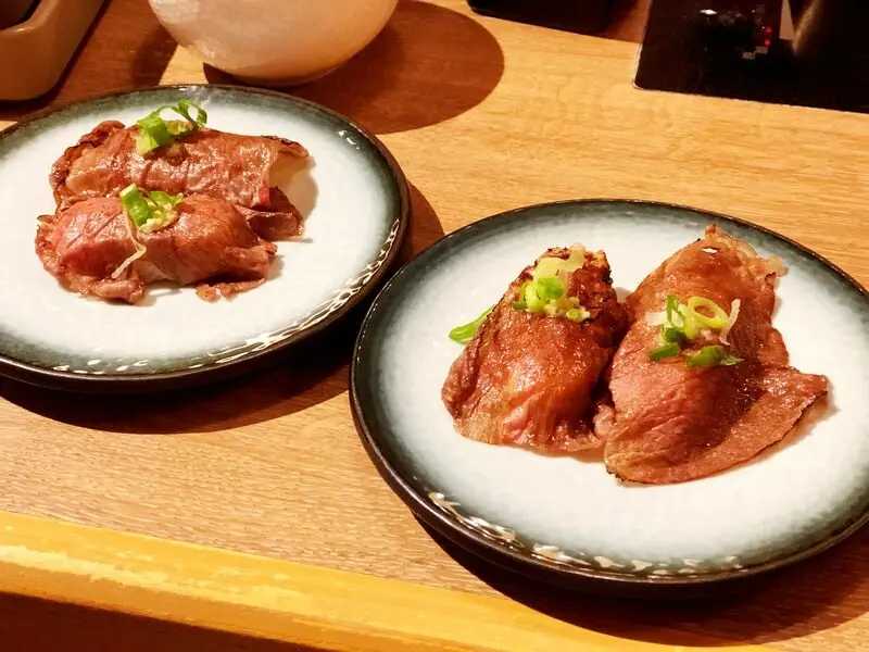 香Q越光米飯裹覆著油脂焦香的和牛肉握壽司。挺美的食物擺盤賣相,可惜和牛肉質口扎實略乾、不夠軟嫩。