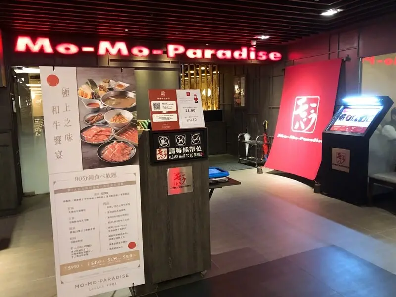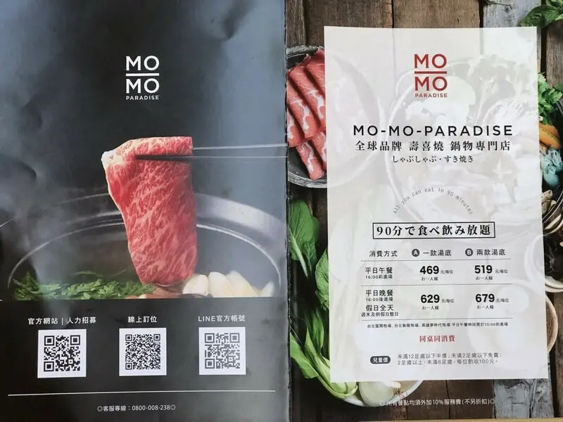 MO-MO-PARADISE 壽喜燒菜單,有五種湯底分別為壽喜燒、涮涮鍋、番茄鮮蔬鍋、和風辛味噌鍋、鹽味豚骨鍋供其選用。一般菜單有五種鮮切肉品 ( 牛、豬、雞 )、米飯與麵、鮮力蛋、嚴選25種當季時蔬和自助飲料吧無限供應品嚐。