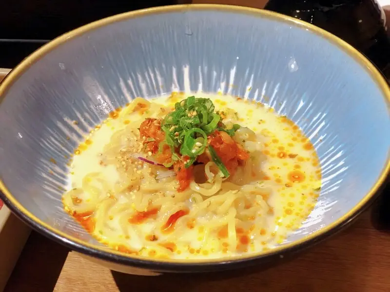 非常適合夏天吃的泡菜豚肉豆乳冷麵。以豆乳為湯底拌入泡菜豚肉和辛味噌,清爽溫潤帶點微辣的風味,麵條 Q 彈帶點嚼勁是好吃的口感。
