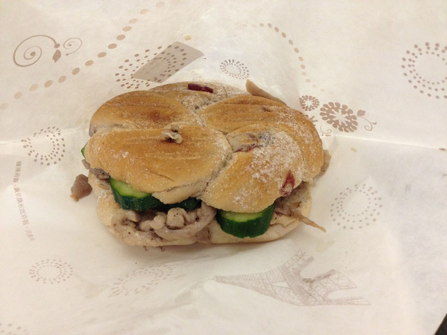 麵包裡面有加蔓越莓,外皮酥酥的,裡面十分鬆軟。豬肉條用大蒜調味,肉質鮮美多汁,還有小黃瓜增加口感。