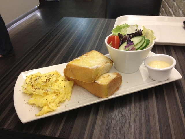 店家強調現點現做,所以人潮眾多的時候要等比較久一點,不過那天等了約半小時,咖啡都快喝完了才上餐。布丁厚片其實有點像法式土司,不過中間感覺煎的不夠,過度濕潤導致口感軟爛。炒蛋加了點起司,灑上胡椒鹽調味。炒的很熟,沒有滑蛋的感覺,但不難吃。沙拉的小黃瓜邊緣看得出白白的纖維,感覺是退冰過的,不過吃起來還算清脆。