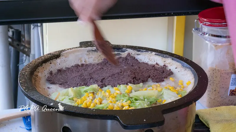 我選了紅豆、花生芝麻和高麗菜三種口味的麥仔煎。店家的紅豆泥是自製的,餡料超級紮實!