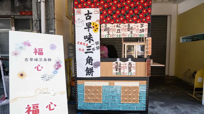 福心古早味三角餅低調地出現在向上市場邊緣的小攤車上,充滿復古氛圍。木板釘成的價目表上有經典花生、芝麻、紅豆等口味,也有鹹口味像起司和高麗菜。薄脆的麵餅皮包裹著豐富餡料,PA最喜歡啃咬那薄脆的邊邊。餅是現點現做,一份約需5分鐘,排隊人多時建議先點餐再去市場逛逛,回頭取餅剛剛好。