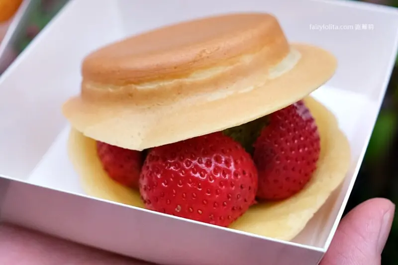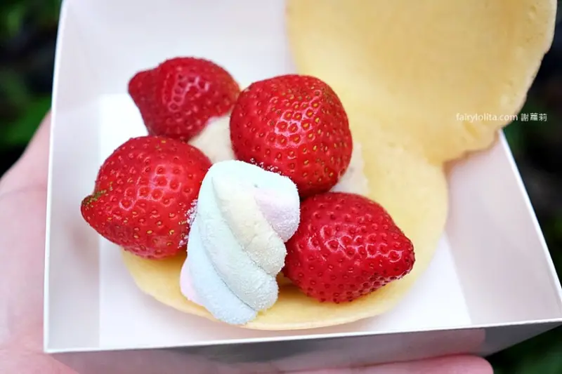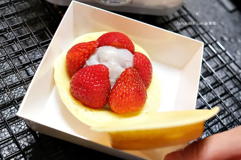 完整型狀長這樣,足足使用四顆美姬草莓,光是草莓成本就要100元,但又加上棉花糖跟草莓卡士達醬,竟然只要60元,CP值完全高到爆炸。
