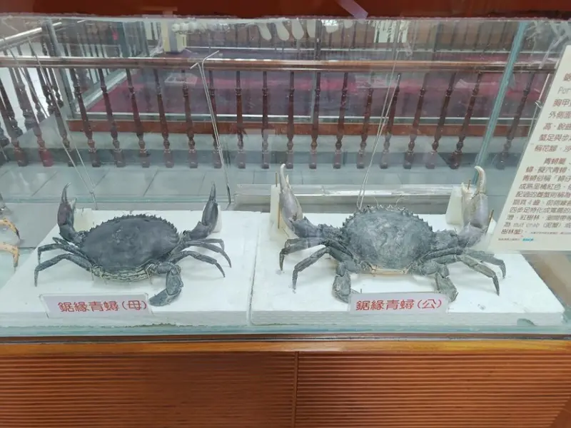 繞了一圈後看到最大的兩隻螃蟹「鋸緣青蟳」,也是台灣常稱的「處女蟳」或「紅蟳」,最大支可以長到將近30公分左右