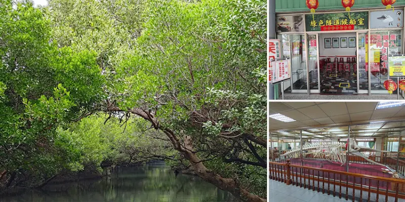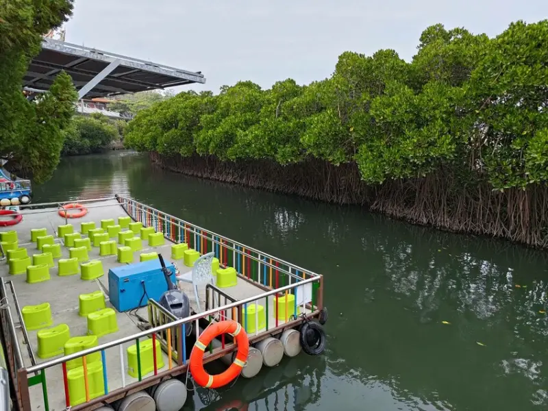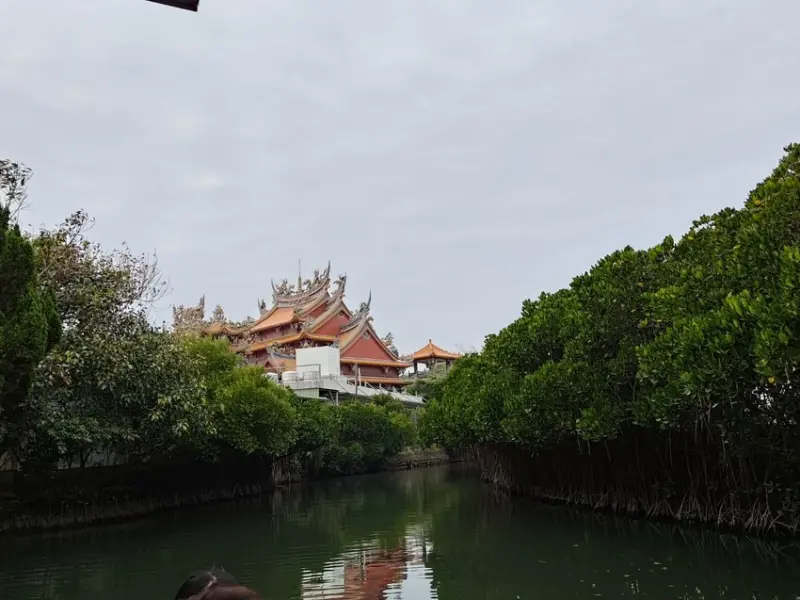 剛行駛出去就能看到不遠處的「四草大眾廟」,在綠色的紅樹林區中橘紅色的廟宇格外顯眼