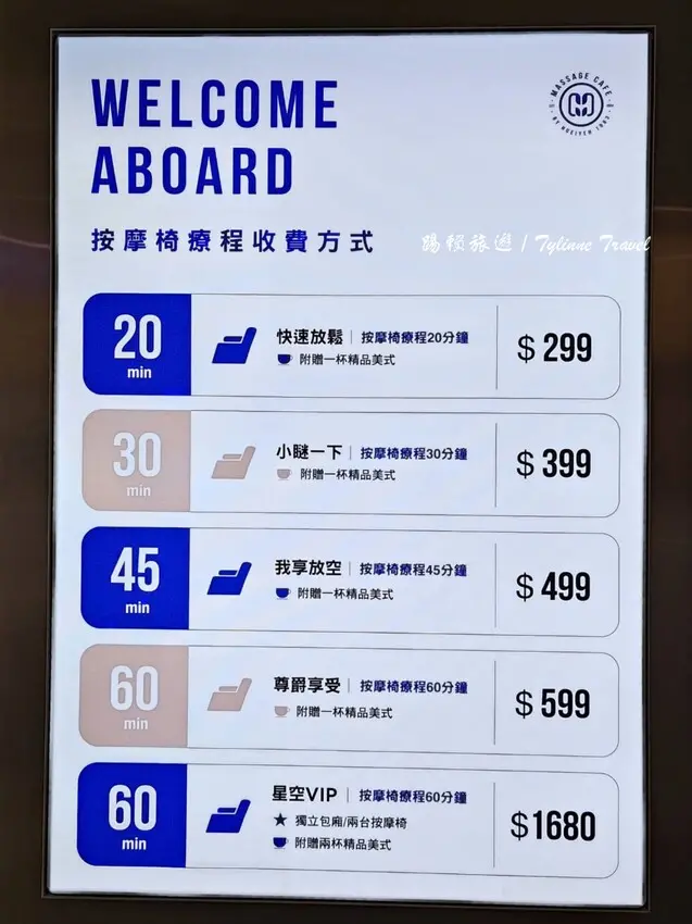 按摩椅療程費用最低是20分鐘299元起,最多是60分鐘,所有的療程都附贈一杯精品美式咖啡。另外「星空VIP」是完全獨立的包廂空間,也比較寬敞舒適。