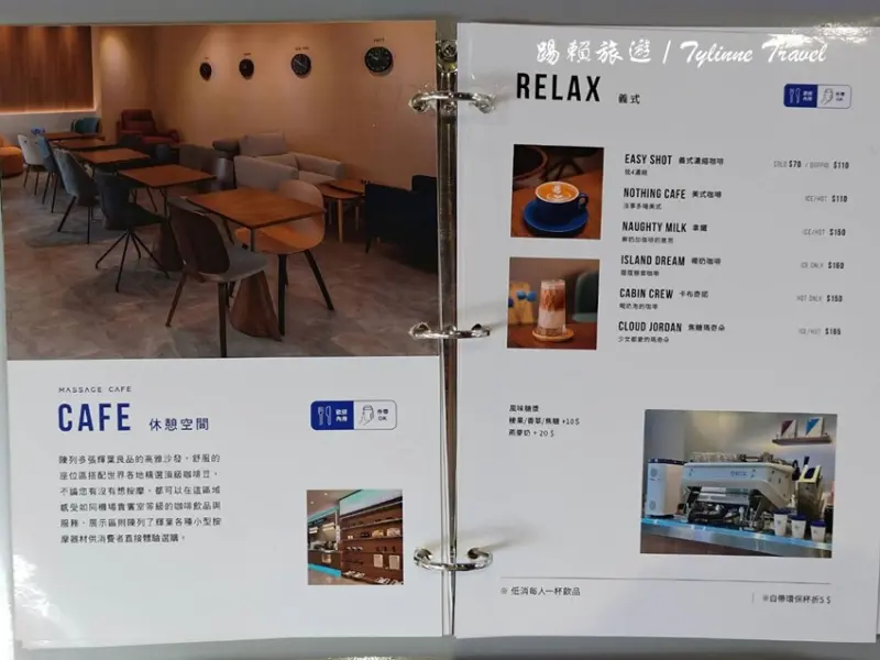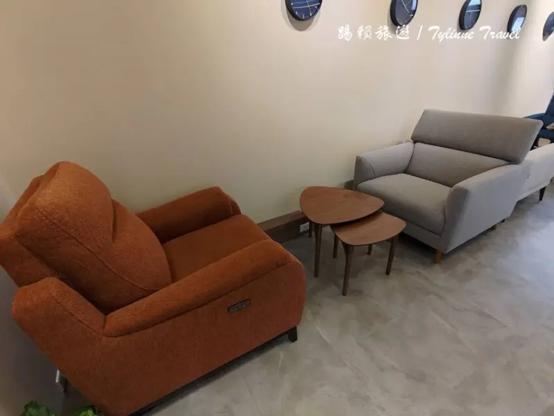 餐飲區設計參考航空貴賓室的高級質感,搭配寬敞舒適的沙發座位,讓人不自覺放慢步調,準備好好享受接下來的按摩椅體驗。牆上還掛滿世界各地的時鐘,就像在機場確認航班時間的感覺,讓人更有出國度假的氛圍。