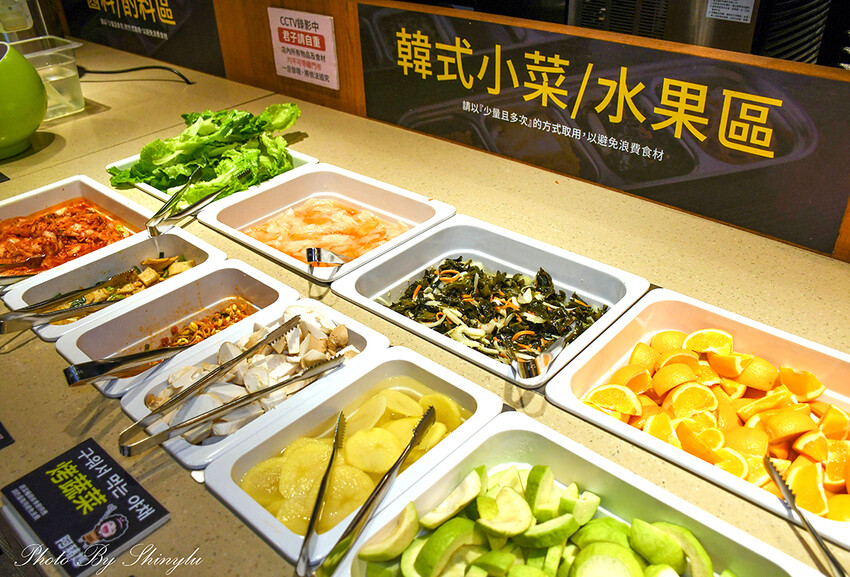 水果、涼拌海帶芽、韓式黃豆芽小菜、拌炒韓國魚板、韓國泡菜…等多種韓式小菜,還有季節水果,也都是無限享用