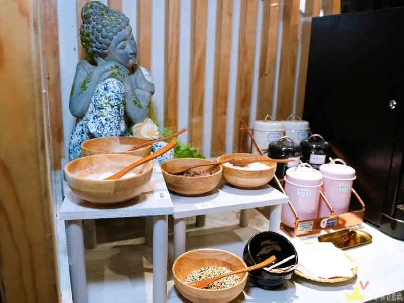 ▲一旁還有配料可以自行添加,有黑糖粉、椰子粉、巧克力脆片、棉花糖、巧克力米等!