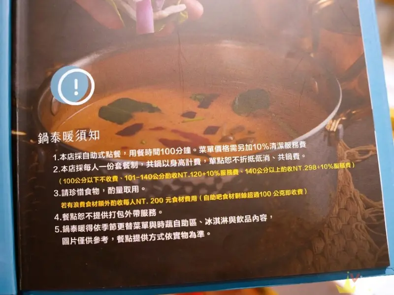 ▲這是「鍋泰暖-桃園中壢店」的完整菜單,供參考(用餐時間限制100分鐘,需要另加10%清潔服務費,100cm以下免費、101-140cm酌收120元+10%、140cm以上酌收298元+10%)(實際販售品項與價格,以店家現場公告為主)