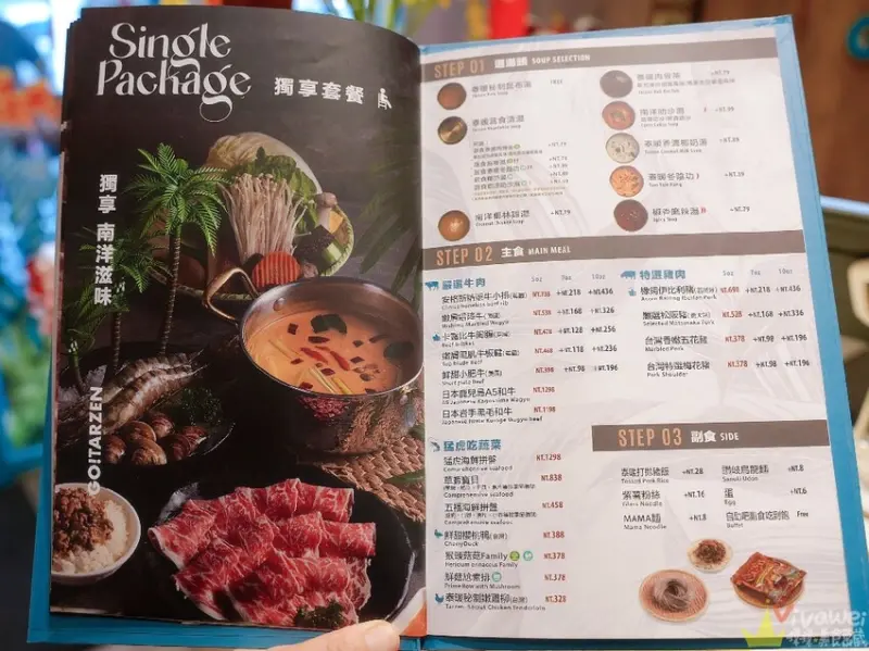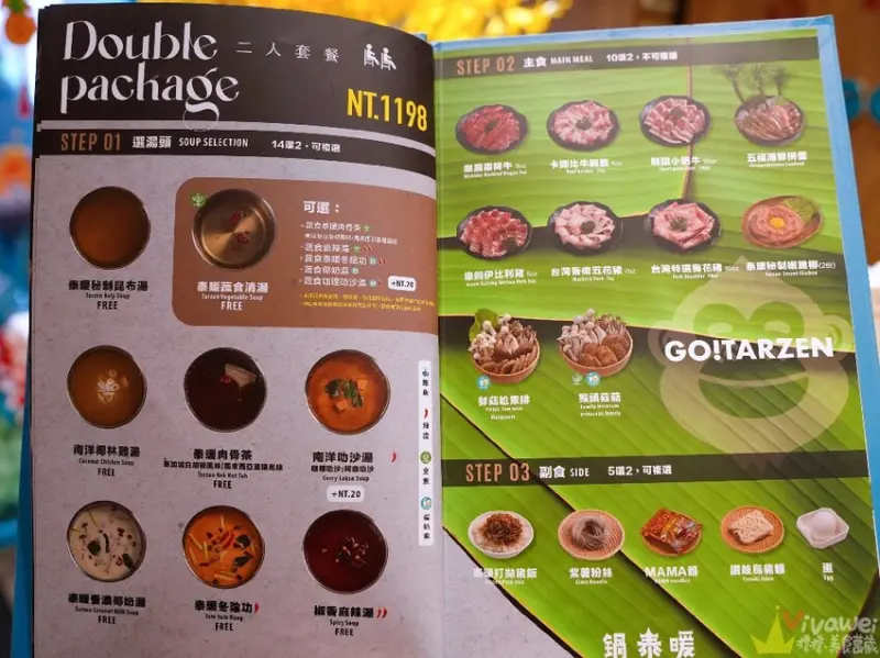 ▲二人套餐湯頭14選2、主食10選2、副食5選2!我們的湯頭選了免加價的冬陰功和肉骨茶,主食選了小肥牛10oz+五福海鮮拼盤,副食選了泰暖打拋豬+紫薯粉絲!