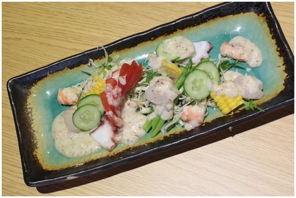 特調沙拉醬甜中帶酸,混合著海鮮與生菜,忍不住一口接著一口分殺完食。