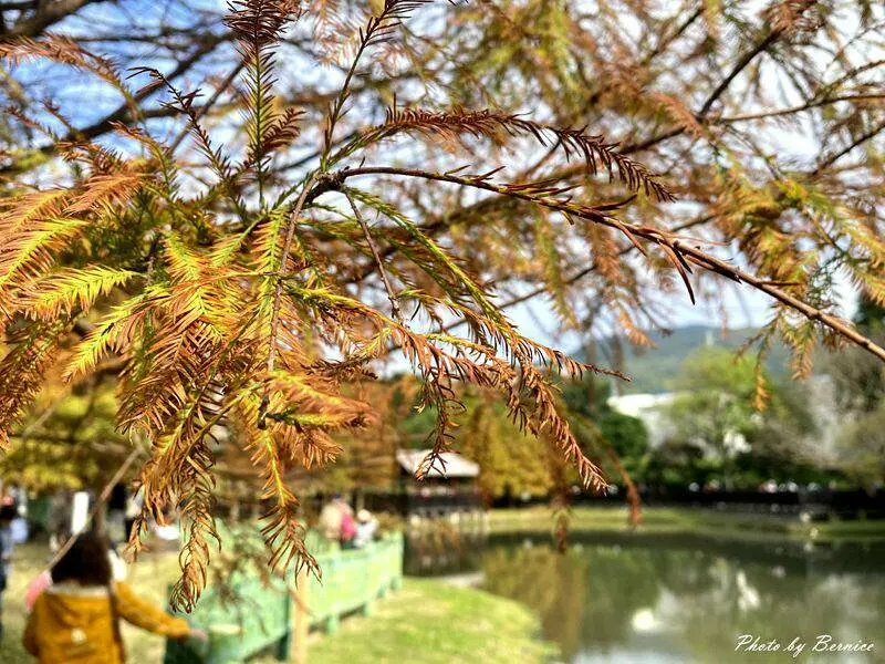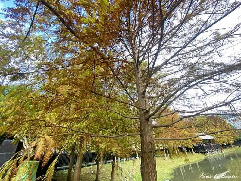 在五年前發現原民公園深處這有一排湖畔落羽松,再加上白色涼亭與藍天白雲美不勝數;經過大家的網傳,現已成了熱門網紅熱點,目前這排湖畔落羽松正在變色中,黃綠紅交錯每個角度都美炸了