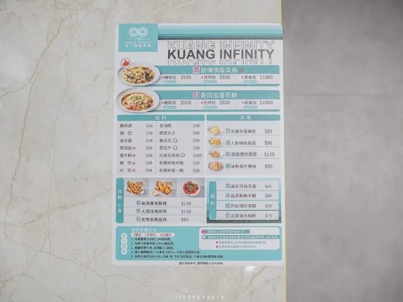主打的「蕭鼓傳情酸菜魚」和不辣的「邦香四溢番茄鮮」可根據用餐人數選擇,分別為機車包(1-2人)、托特包(2-3人)及鉑金包(3-4人),價格分別為550元、820元及1080元。若想要更加豐盛的用餐體驗,顧客還可以加點鍋巴、老油條、花枝滑等配料,價格範圍約在49元至188元之間。另外,菜單中還提供多款可口的涼菜、炸物及飲品,價格從銅板價到百元不等,十分親民。