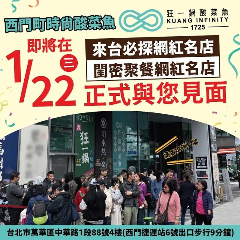 狂一鍋酸菜魚引領時尚美食風潮,在試營運期間就引來滿滿的人潮,無論平假日,大樓前總有人排隊,就為了一嚐這頂級酸菜魚。狂一鍋酸菜魚成為許多網紅的打卡名店,也是不少閨密聚餐的不二選擇。狂一鍋酸菜魚將於2025年1月22日(週三)盛大開幕,期待與各位喜愛美食的人一同共襄盛舉。