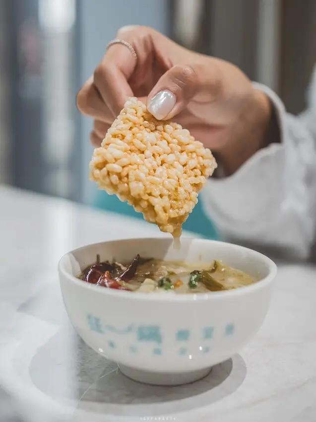 吃酸菜魚怎麼能不點上一碗白米飯呢?餐廳提供半碗或一碗的選擇,讓人不必拘泥於每人都點上一碗或是分享。使用國寶級冠軍米「益全香米」,口感Q彈且粒粒分明,搭配酸菜魚的湯汁,更顯美味。若老油條之於麻辣火鍋,那麼鍋巴就是酸菜魚的絕佳搭檔。鍋巴本身無味,但沾上湯汁後,口感層次豐富,十分美妙。若有加點炸饅頭,也可以將鍋巴沾煉乳吃,變成甜香風味。