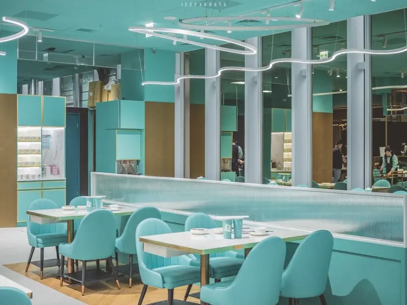 以「美食翻玩」為概念,用餐環境被精心打造為一個時尚的精品藍國度。流線型的燈飾和精品藍的色彩交織,無數面的鏡子反射出高雅的氛圍,讓整體空間呈現出窗明淨几的時尚清新感。每一張大理石桌面都散發著奢華,而餐巾紙、筷子及牙線棒則巧妙地藏於桌下抽屜中,隨手可及,增添了用餐的便利性。