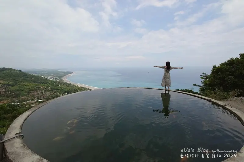 【台東景點】華源觀景台-天空之鏡,遠眺太平洋湛藍美麗的海岸將W型華源海灣盡收眼底,蓄水池的倒影與海灣構成美麗的景色,所謂的台東藍完全展現在你眼前。台東打卡景點