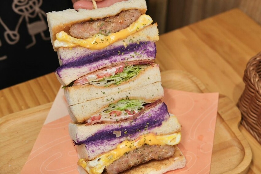 ▼超級巨無霸的招牌夢幻紫薯總匯,使用四層吐司搭配食材層層堆疊,加入花生醬、培根、漢堡肉、歐姆蛋、起司、生菜、紫薯,還有超酷的花生醬與紫薯的組合,每一口都有著豐富多變風味,推薦大家一定要點起來!