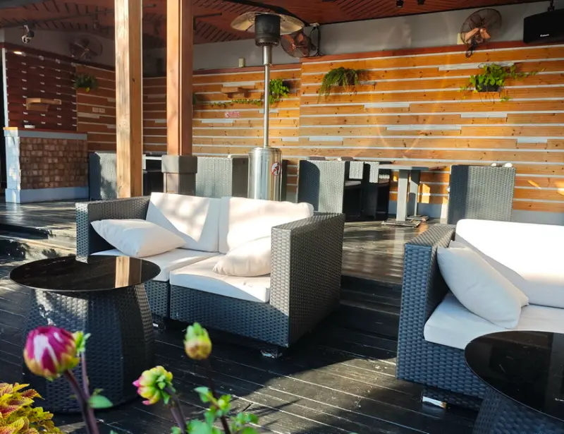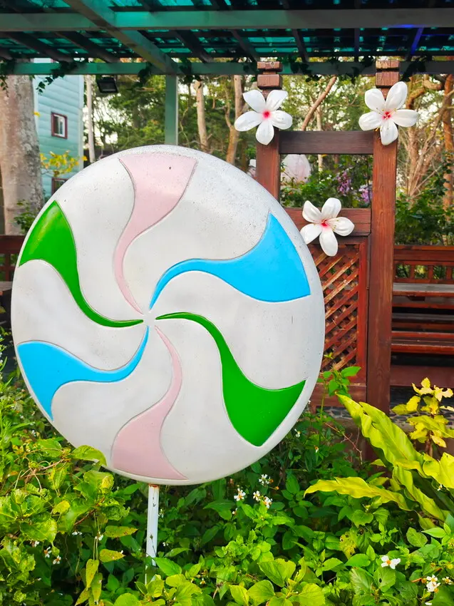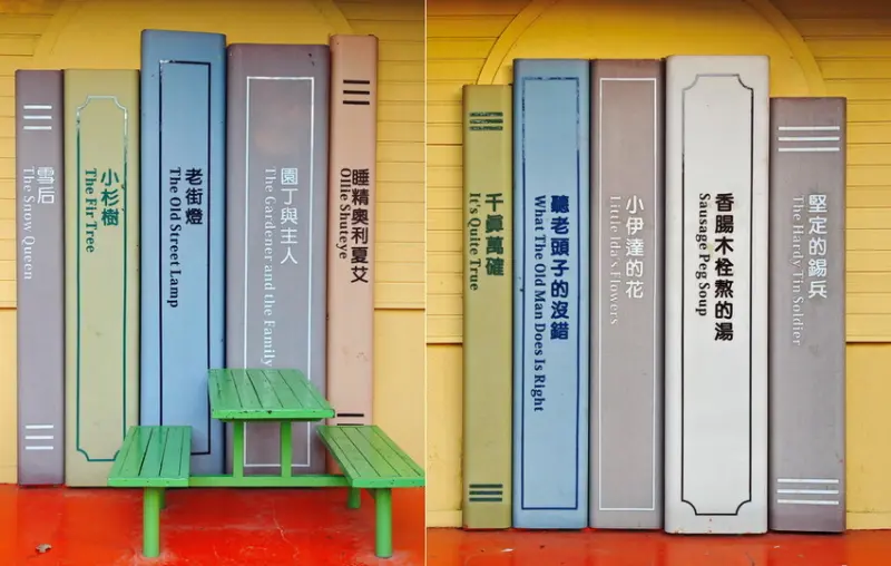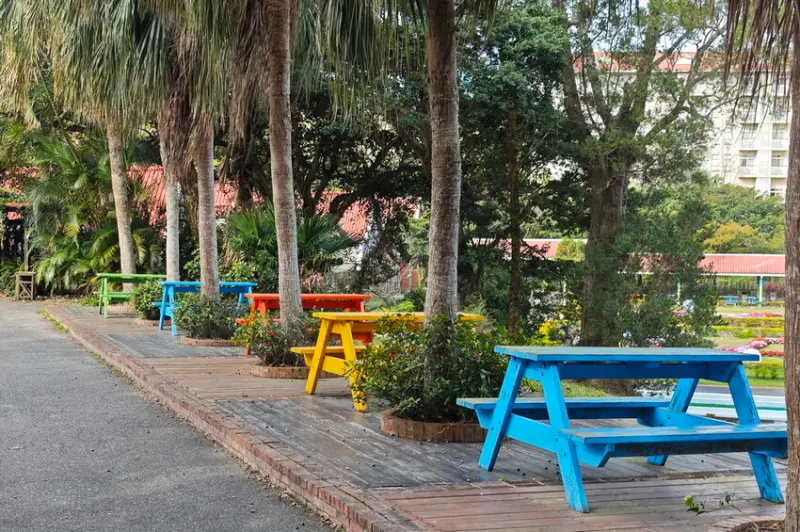 可以休息也可以一群朋友擺姿勢拍照的彩色桌椅。