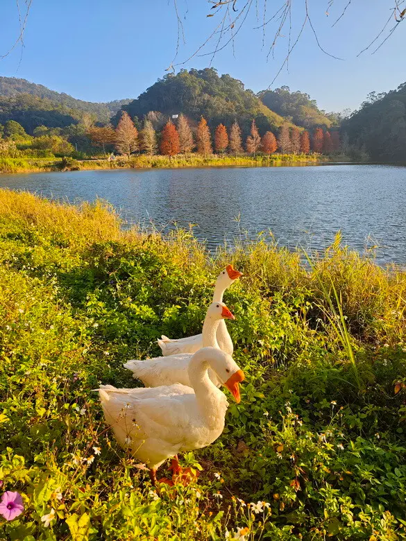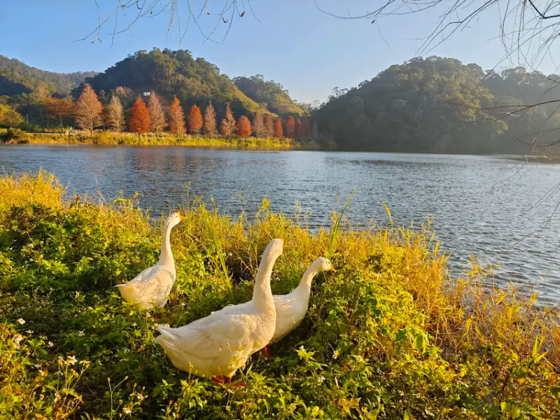 幾隻鵝一搖一擺走來,不時抬頭嘎幾聲,遠處還有美麗的落羽松,時光彷彿停滯了下來。