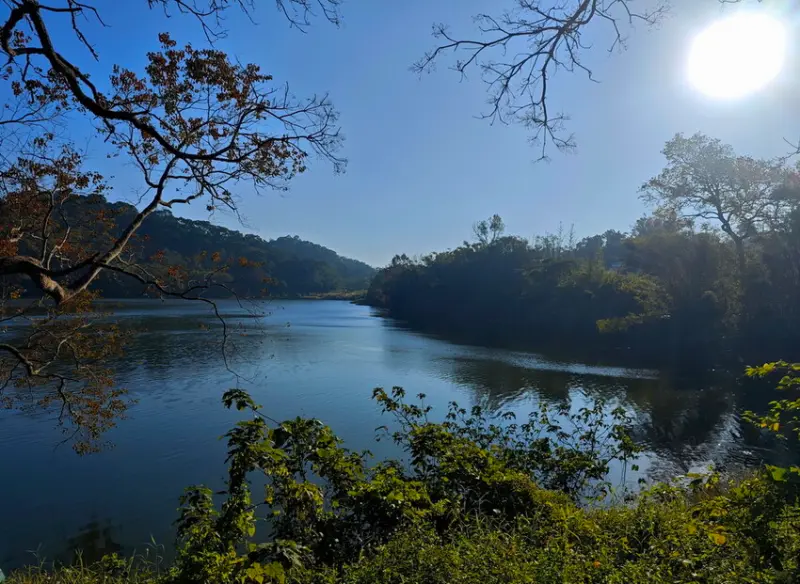 遠山如黛,倒映在湖水中,湖水倒映著藍天白雲,湖面彷如是一幅國畫。陽光灑下,湖面波光粼粼,美得像首詩。