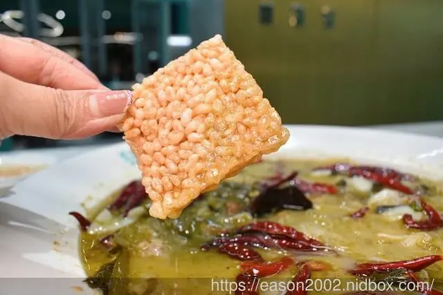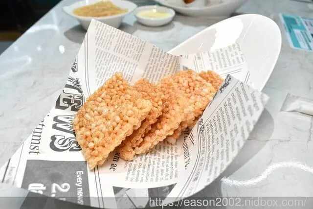 吃起來就像米餅般酥脆可口,帶點微微的米香與鹹味,可以輕沾酸菜魚湯底一起吃,也可以搭配香甜煉乳,雙重吃法。