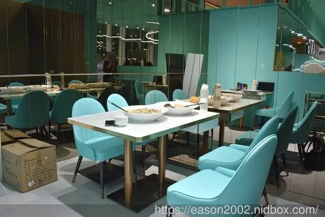 以時尚精品 Tiffany綠 為室內設計的主要風格,利用鏡面折射創造空間感,天花板特別的流線條,就像『美食翻玩界的天花板』-三冠玩: