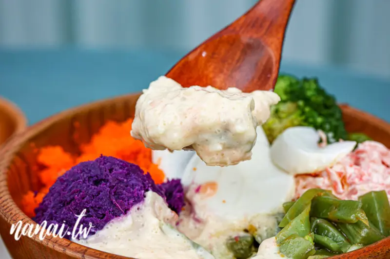 我最常吃就是自選lala,基底價為145元,有提供主食蛋白質選一、基底選一、佐菜選五、醬料包等品項,而我選擇芥末燻鮭泥,基底搭配生菜和紫米,佐菜則點了紫地瓜泥、蟹肉沙拉、珍味魚卵、鮮脆貢菜、+5元綠花椰、+5元水煮蛋、在加購85元義式松阪豬,這樣加起來約250元有找,該有的蛋白質、蔬菜、主食、精緻澱粉通通有,整個非常澎湃,加購彈性更不用擔心吃不飽。