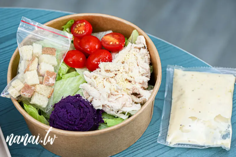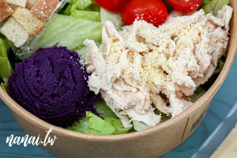 不只美生菜,還加入小番茄、麵包丁、紫色地瓜陪襯,讓凱撒雞肉沙拉吃得更澎湃,而且主角青檸雞胸很好吃,特別是加入青寧調味舒肥,再將撕成長條狀佐入鹹香乳酪絲,輕咬一口肉質鮮嫩又有保水度,吃到後面更沒有惱人柴感。