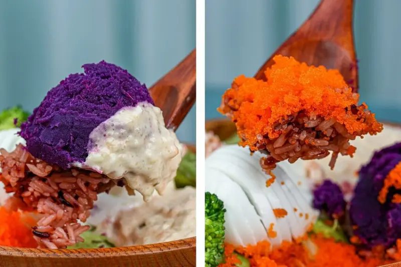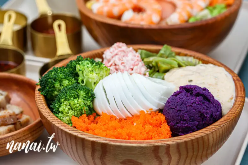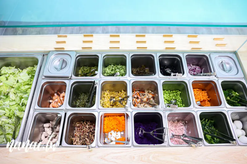 琳瑯滿目的食材在展示櫃中一字排開,更能一目了然選擇自己想吃配料,重點佐菜多達16種以上,像是蝦仁、鮭魚、小黃瓜、紫洋蔥、黑豆、花椰菜、蟹肉沙拉、鮮脆貢菜、紫地瓜泥、毛豆、水煮蛋..等通通自行挑選,而且所有食材不加任何一滴油,採原形食物簡單呈現,讓你吃得輕鬆無負擔。另外配料區保持的相當乾淨,衛生上讓人格外放心。