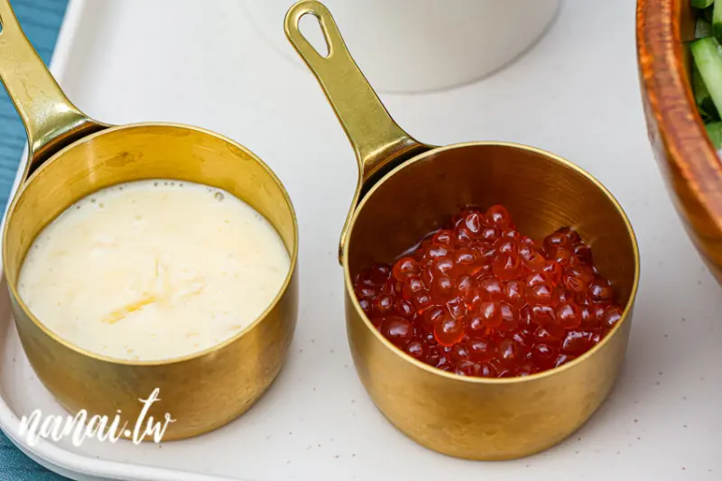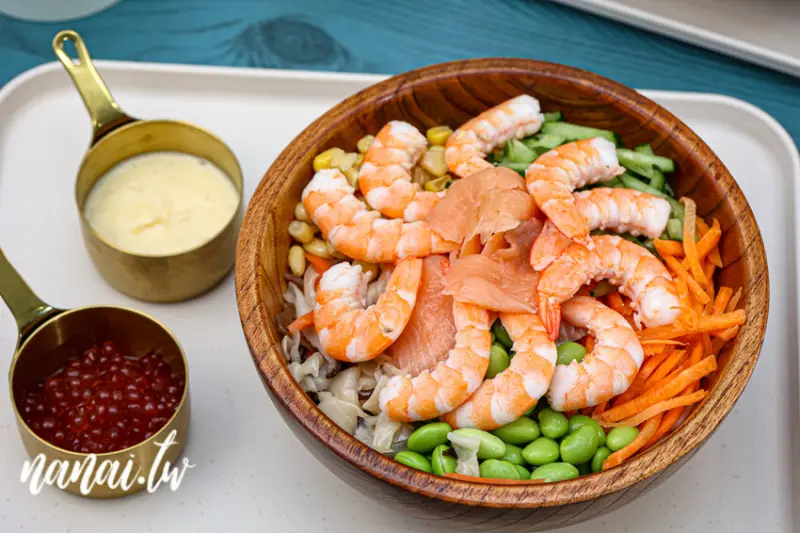 鹽漬鮭魚卵提供小盅給客人自行加進去。咱們拿著鮭魚卵望著裡面顆顆橙紅飽滿鮭魚卵,每顆呈現晶瑩剔透色澤,光看就令人垂涎三尺,接著到至鮮蝦鮭魚卵Poke餐點中,那個畫面實在好欠吃,後來豪邁挖起一口咬下,OMG~鮭魚卵在嘴裡逼逼啵啵,那種瘋狂爆汁又帶點海鹹香味超過癮。