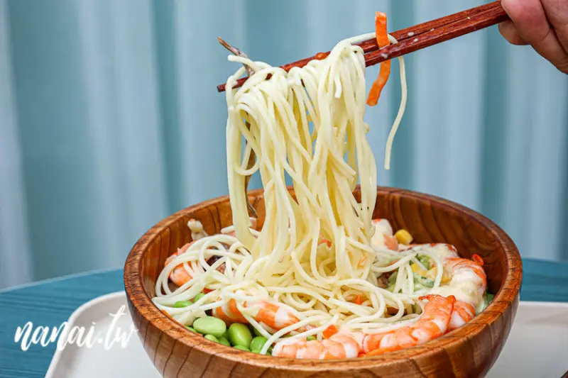 義大利冷麵是LaLaPoke中清店限定,麵條比涼麵還要好吃,重點它是選用碳水蛋白質小麥製作,嚼起來很Q彈,且保持一點咬勁,再搭配特調橙汁沙拉,特別是加了美乃滋和柳橙原汁與鳳梨果粒,酸甜清爽滋味在舌尖綻放,隱約有果粒與水果香,吃完一整碗也不覺得膩。