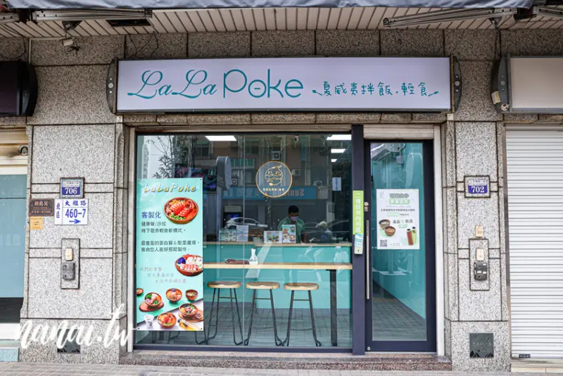新開的lalapoke夏威夷拌飯輕食位於台中中清路一段706號,緊鄰著天津路年貨大街和曉明女子高級中學等知名地標。店家門面有點不明顯,建議先認路易莎咖啡中清門市和登峰21社區就會找得到。