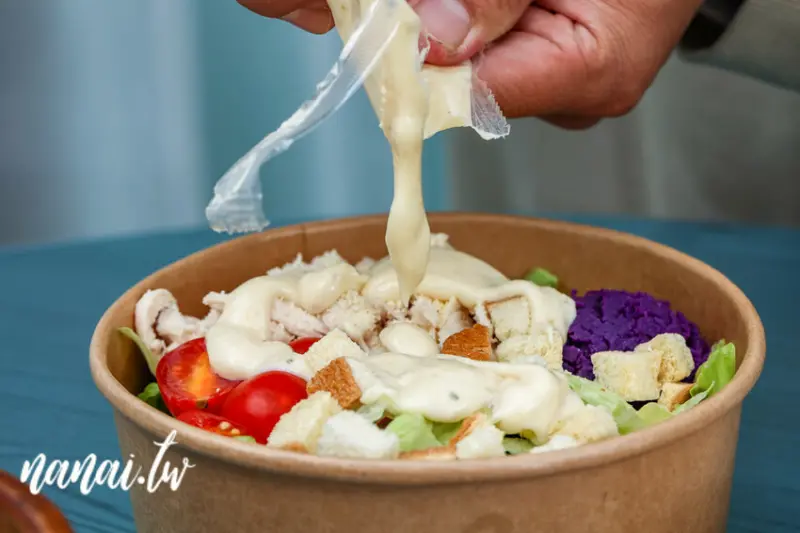 凱撒雞肉沙拉會提供一包特調凱撒醬,醬汁雖然濃稠,嚐起來鹹中帶甜,口腔內的乾酪香和鯧魚風味超迷人,更是讓人一吃就會停不下來涮嘴,只要有買都會淋超多~