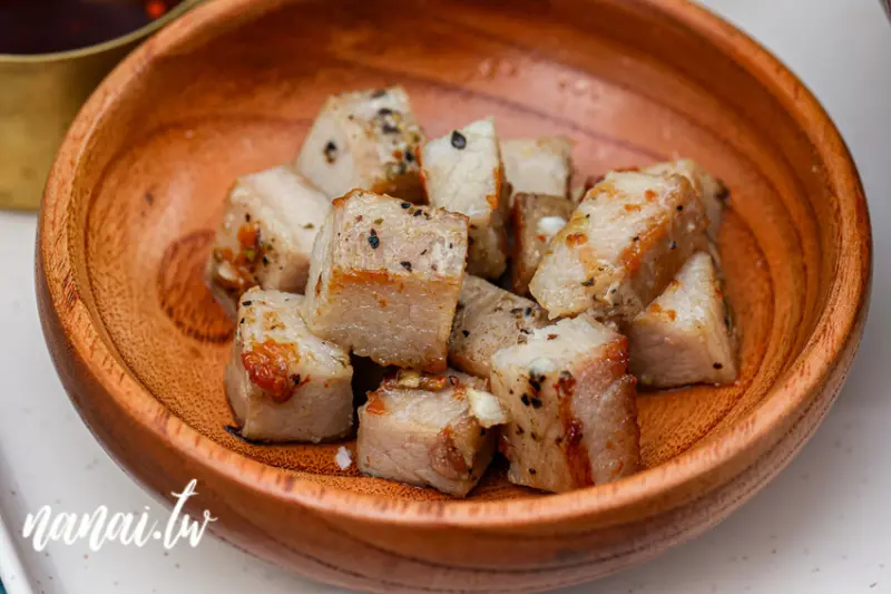 義式松阪豬切成正方形大小,煎得外皮焦香,肉質嫩中帶脆,嘴裡散發迷人肉香,好吃到一下子就掃盤。