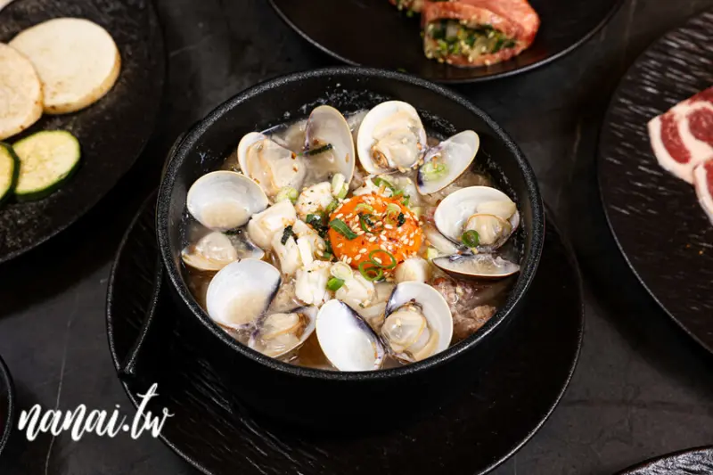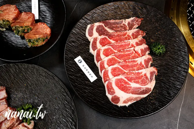 美國安格斯肩胛牛小排有著大理石花紋,油脂分布均勻,放在烤盤吱吱作響約五分熟度,再搭配昆布鹽一起入口,柔軟細嫩口感在嘴裡劃開,此時甜甜肉汁瞬間蔓延開來,讓人忍不住一片接著一片。