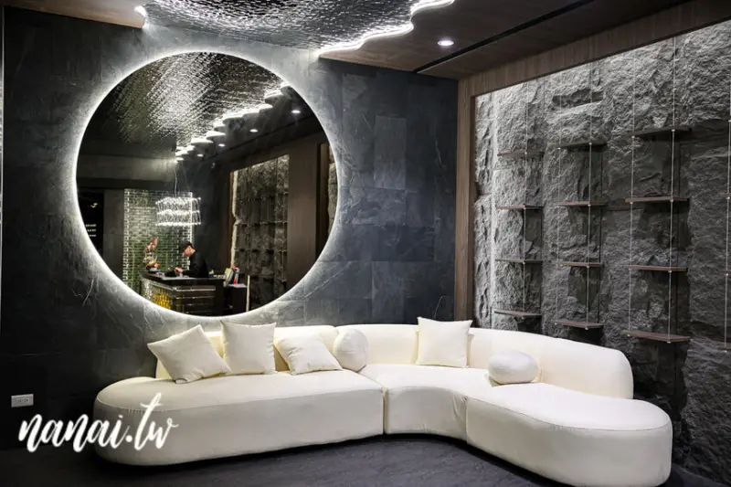等待帶位時就被等候區吸引,尤其是美到炸掉的白色真皮沙發,再搭配宛如鏡花水月般的月亮鏡,不僅呈現奢華低調感,拍起照來更是好看。