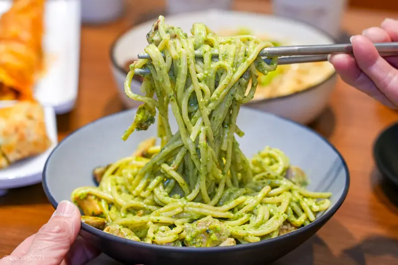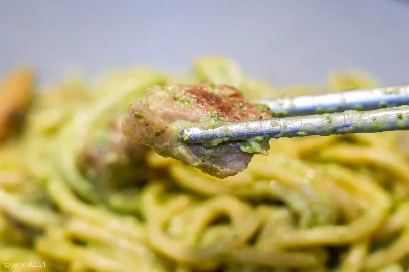 青醬菇雞麵,青醬味道適中,麵體軟硬剛好,雞肉軟嫩不柴,還帶有淡淡的菇香,口感相當鮮美!